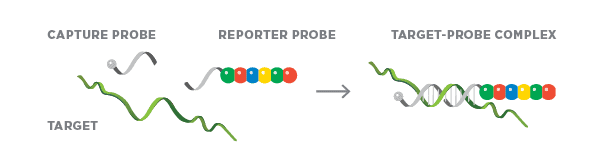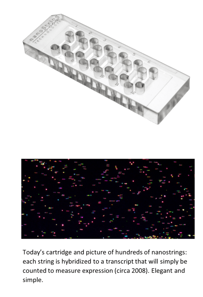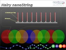 Nanostring: noun; a piece of DNA (probe) attached to a linear sequence of fluorophores made up of four different colors (barcode). Each probe is complementary to a unique target oligonucleotide.