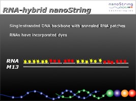 The basic structure of the nanostring had to change too. The initial nanostring structure had a six kB backbone like current NanoString probes; but, instead of a linear double-stranded molecule, it had branches coming off a single-stranded backbone, giving it a ‘hairy’ look. These branches consisted of oligos each branch hybridized with a dye molecule. These hairy nanostrings were sticky and not stable in solution. One of Philippa’s biggest contributions soon after she arrived was to figure out how to hybridize RNA to the linear DNA structure probes are currently made from. Key to this was making the 1.1 kB in vitro transcribed fluorescent RNA patches.