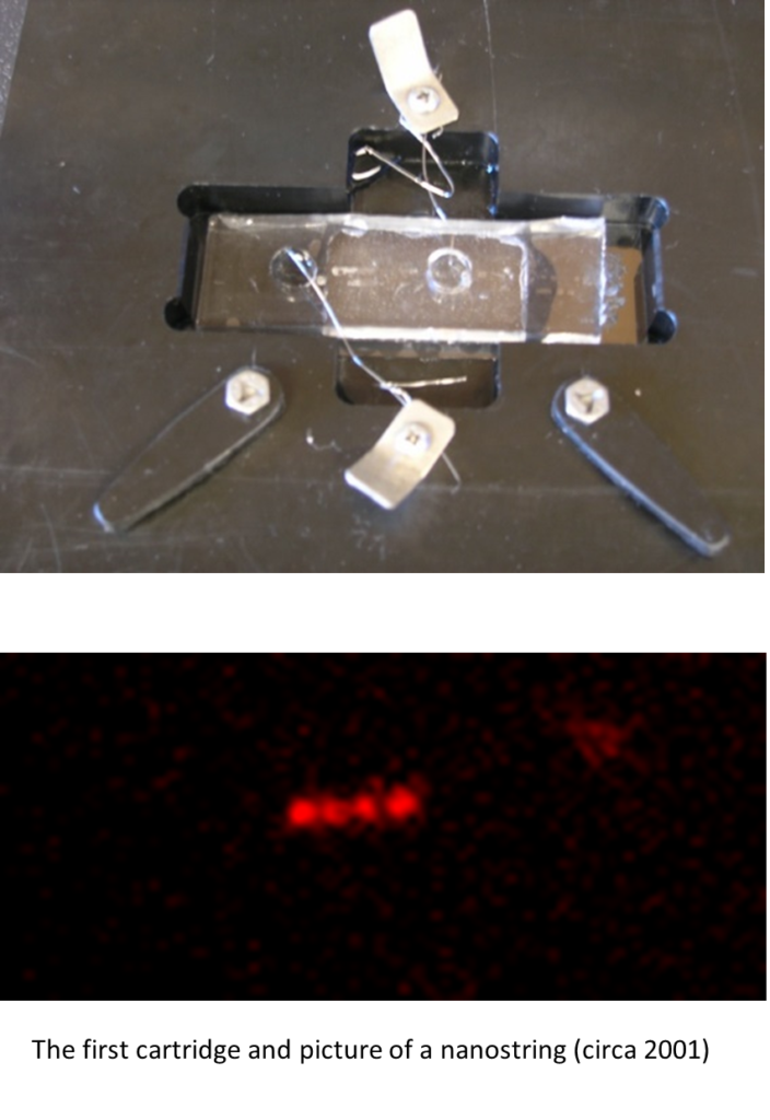 To convince investors, the intrepid NanoStringers had to demonstrate that they could make the nanostrings, purify them, image them, and build a device to support the technology. If you are familiar with the nCounter MAX Analysis System, hybridized targets are stretched on a cartridge in the Prep Station and then counted in the Digital Analyzer. If you look at the images below of what they presented to investors as a prototype cartridge and what a cartridge looks like today, you will notice quite the evolution!