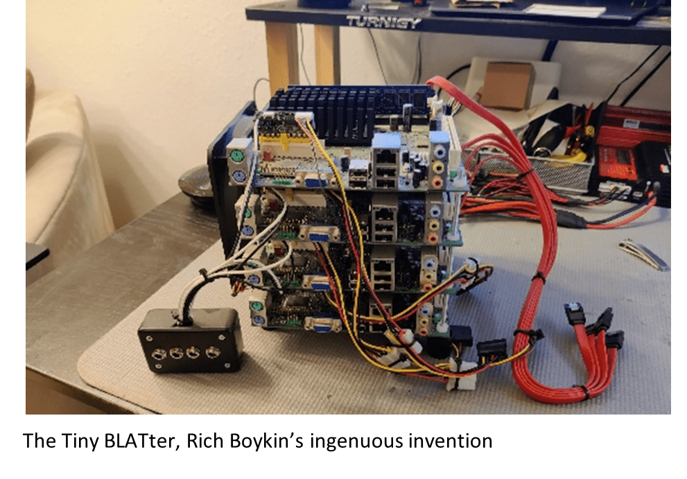 To overcome the lack of money for sophisticated hardware, Rich Boykin cobbled together some old hardware and made a little 4-node mini-cluster whose sole job was to automate the BLATing of the whole genome. All this little guy did 24/7 was just BLAT probes against the genome and store them in a database.