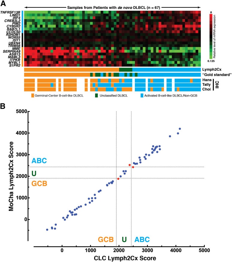 Characterized by significant heterogeneity, DLBCL has led to the discovery of distinct subtypes based on gene expression profile patterns detected through high-throughput gene expression methods. This technology has enabled the identification of disease-specific RNA signatures or gene expression profiles by analyzing and quantifying hundreds of RNA transcripts simultaneously.1Zamò A, Gerhard-Hartmann E, Ott G, et al. Routine application of the Lymph2Cx assay for the subclassification of aggressive B-cell lymphoma: report of a prospective real-world series. Virchows Arch. 2022;481(6):935-943. doi:10.1007/s00428-022-03420-6 Two main subtypes, resembling germinal center B-cells (GCB-like subtype) and in vitro activated B-cells (ABC-like subtype), were identified in DLBCL through this technology. However, subsequent studies have underscored that the cell-of-origin, COO, classification subtypes into GCB, ABC, or unclassified, UC, is critical for prognosis and treatment decisions.