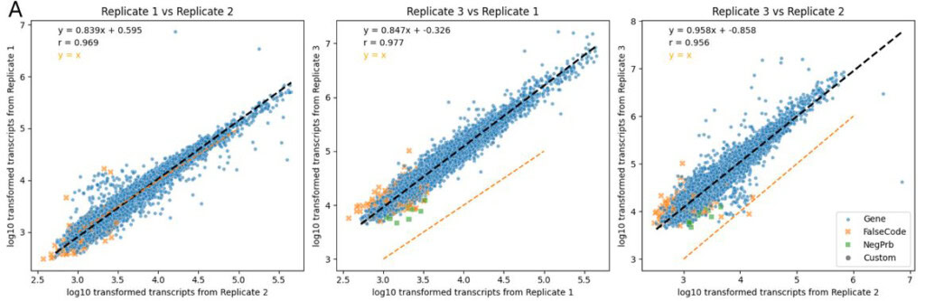The new preprint demonstrates the CosMx WTX assay’s ability to detect thousands of transcripts per cell across multiple FFPE tissue types, including colon, pancreas, breast, brain, kidney, and skin. Uniform and reproducible data quality was observed, with four logs of dynamic range and a high correlation to bulk RNA-seq for genes above a practical detection threshold.