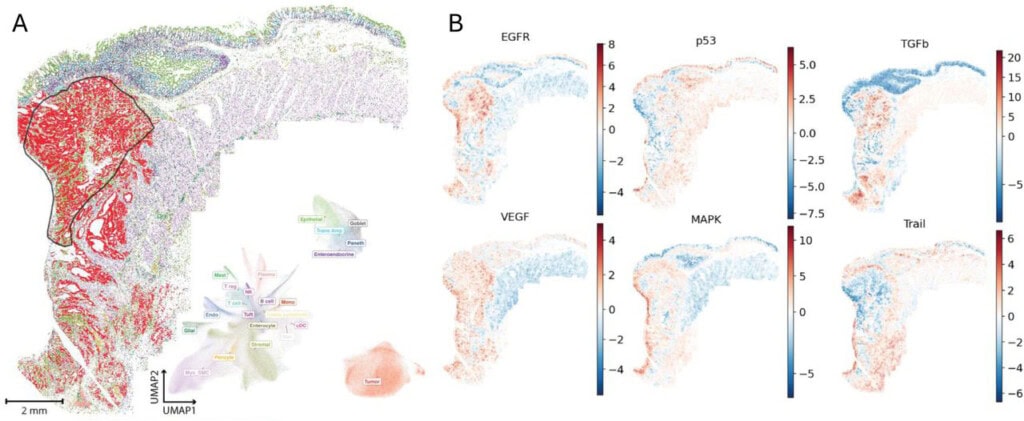 One highlight in the paper focuses on colon adenocarcinoma, where we combined CosMx WTX data with pathway analyses. We discovered increased activity of pathways such as EGFR, TGF-beta, and VEGF within the tumor nest, coupled with decreased expression of certain apoptotic signals (e.g., TRAIL). This reflects an aggressive tumor phenotype, consistent with pro-survival and pro-angiogenesis signals. By localizing these expression patterns at a single-cell scale, the study showed how spatial context reveals distinct “pockets” of tumor microenvironment heterogeneity, which is key information that is impossible to detect by methods requiring cell dissociation. Additionally, monitoring all biochemical pathways at once with the WTX panel enables a completely novel “pathways-first” approach to spatial biology research.