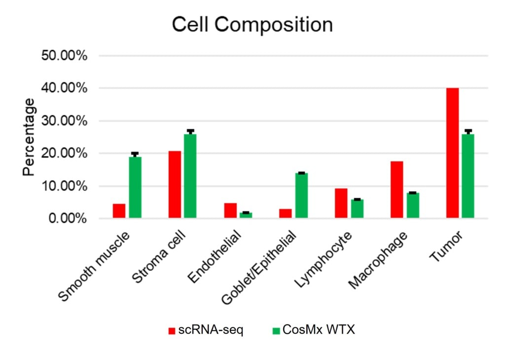 In our side-by-side comparison of matched FFPE colorectal carcinoma samples, we found that scRNA-seq underrepresented certain cell types, particularly those that were large or more difficult to dissociate. In contrast, the CosMx WTX panel revealed a richer cellular composition, capturing epithelial, stromal, immune, and tumor cells in their native positions. This underscores one of the most impactful benefits of spatial methods: every cell stays put and is counted.