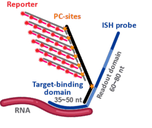 At the heart of any spatial platform is its signal generation chemistry. The CosMx SMI platform utilizes a direct hybridization chemistry, meaning there is zero enzymatic amplification involved in signal generation. A CosMx probe is comprised of two parts: 1) a single-stranded ISH probe (Figure 1), which consists of a target-binding domain that binds directly and specifically to complementary RNA sequences in cells and 2) a readout domain which serves as landing sites for branched fluorescent reporter structures to bind to so that the optical barcode for each bound ISH probe can be read out on the CosMx instrument through sequential imaging cycles. The short 35-50 nucleotide target binding domains also enable robust performance in FFPE tissues, which are the most critical sample type for spatial biology.