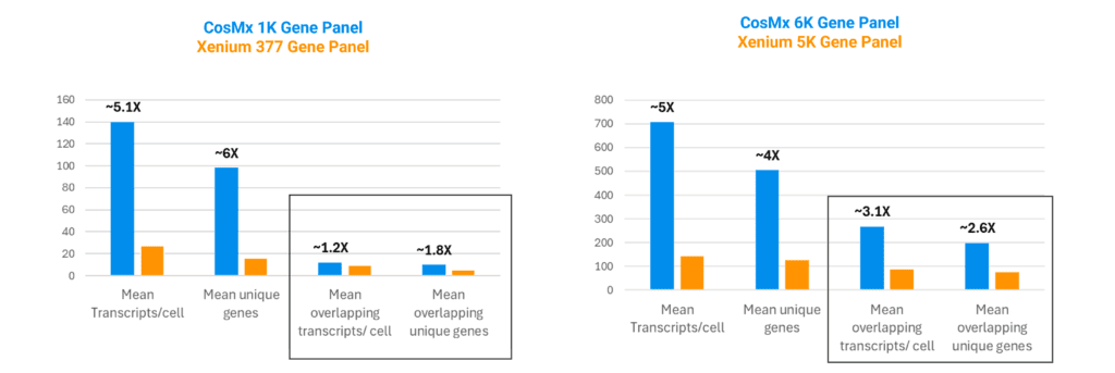 The spatial biology field is currently plagued by flawed “benchmarking studies”, comparisons with conclusions built on an “N of 1” (2) or worse, assays run on tissue sections that have been left to degrade for weeks on a benchtop (3). True comparisons require a clean and unbiased experimental design. In a recent, highly controlled study out of Northwestern University, researchers eliminated these confounding variables (4). They took 16 real-world FFPE blocks from 11 patients, cut sequential sections at identical thicknesses, and prepared them immediately for both the CosMx 1.0 and Xenium platforms to erase RNA degradation bias. To ensure an apples-to-apples comparison, they restricted their analysis strictly to the overlapping genes shared by both panels. The results demonstrated: when experimental noise is stripped away and platforms compete purely on the sensitivity of their chemistry, CosMx routinely detects exponentially more transcripts and up to six times the gene diversity (Figure 2).