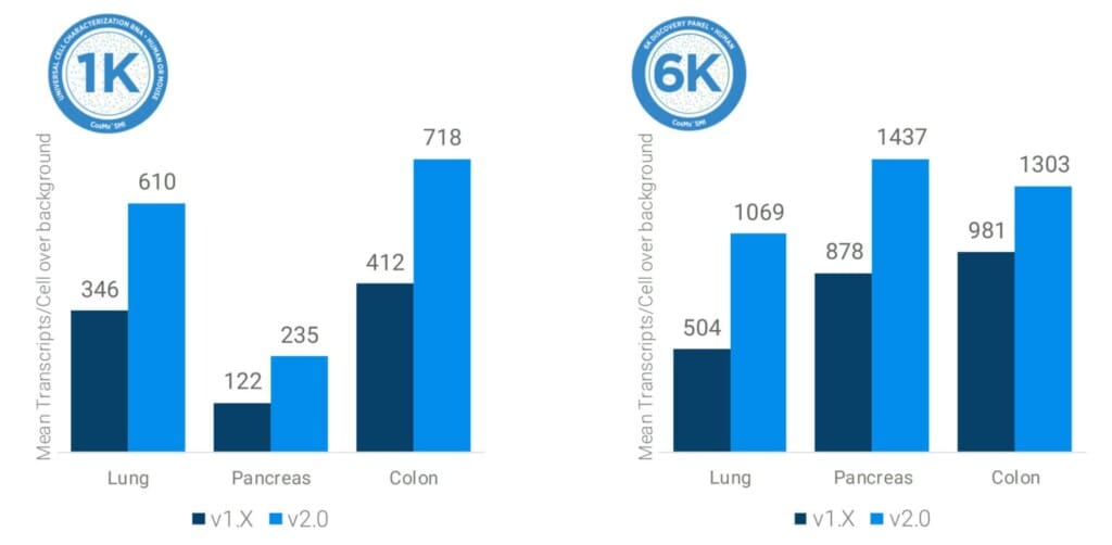 With the introduction of the CosMx 2.0 integrated software and hardware advancements, CosMx instruments benefit from an additional up to 2x increase in RNA detection efficiency across all RNA assays. This includes both 1K and 6K targeted panels and enables even more transcripts to be detected per cell (Figure 3). Crucially, this doubling of counts is achieved without negatively impacting the signal-to-noise ratio.