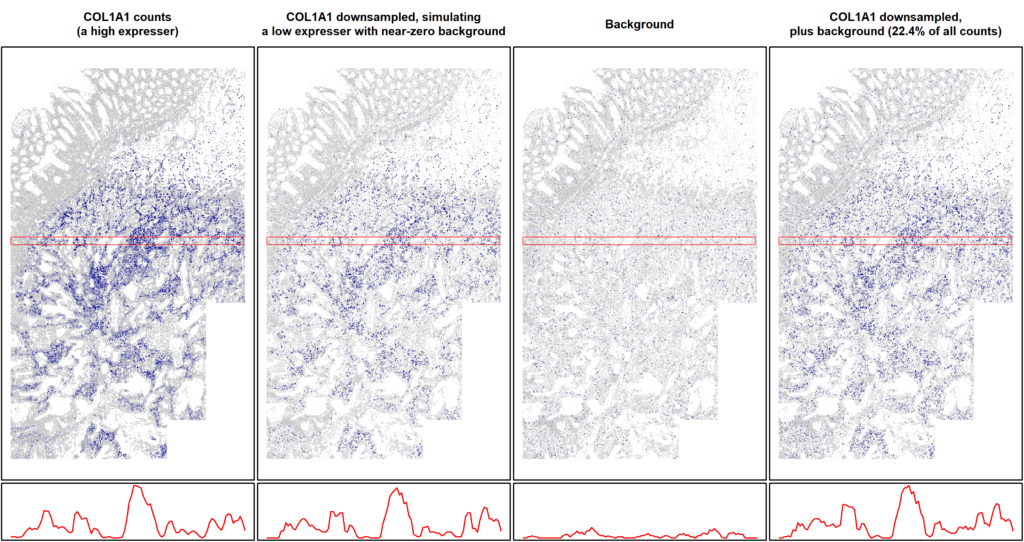 This dynamic is demonstrated through signal downsampling simulations (as showcased in Figure 4): if you take a highly specific, high-expressing gene like COL1A1, computationally downsample its counts to simulate a sparse, low-expressing target, and then artificially add background noise so that it comprises over 20% of the total signal, the native spatial architecture of the tissue still remains intact. The reality is, when your fundamental probe chemistry is rigorously specific, true spatial patterns will still appear in your tissue (5).