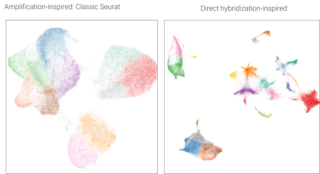 When you feed this rich, unamplified genomic tail into a standard adjacency-based clustering tool, the algorithm misinterprets the data. Because there are no artificially inflated peaks to force separation, the principal components collapse, pulling distinctly different cell types together. This is why applying, for example, Seurat to direct hybridization data will notoriously fuse T-cells, B-cells, and plasma cells into a single, biologically meaningless cluster (Figure 5).