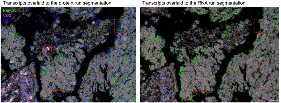 Figure 2. Multiomics workflow related cell loss in a WTX multiomics run. Cells located in stromal regions or at the edge of tissue regions (highlighted with red boxes) may be more prone to loss.