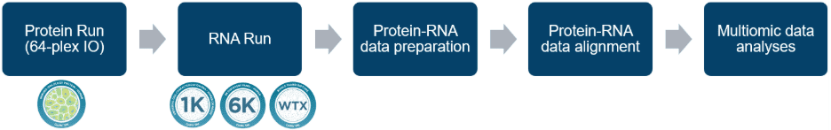 - Protein Assay: A 64-plex protein panel is applied for IO protein mapping. Unique to the multiomics workflow, antibodies are temporarily fixed in situ using a reversible fixative Dithiobis(succinimidyl propionate) (DSP), which is removed post-data collection with a reducing reagent Tris-(2-Carboxyethyl)phosphine (TCEP). The 64-plex protein panel is also run using a newly introduced removable flow cell coverslip in place of the standard flow cell coverslip.