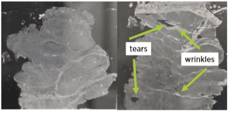 Beginning with flat, well-mounted sections is important to maintain tissue integrity. Figure 4 shows the difference between high-quality and low-quality FFPE sections. The section shown on the left has few flaws and performed well during CosMx SMI workflow. The section on the right contains many tears and wrinkles, which can result in tissue detachment from the slide; this tissue section performed poorly during the sample preparation workflow.