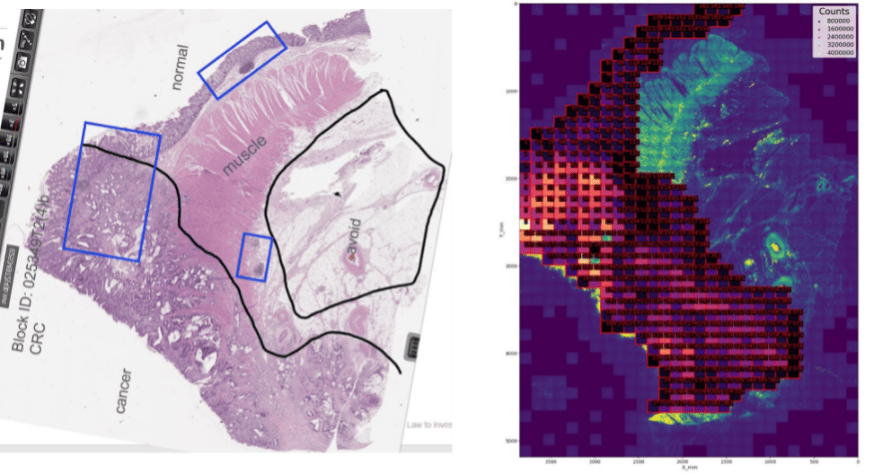 Consider the scientific question when selecting tissue areas. For example, the focus of the study below (Figure 5) was to study cancer, muscle, and normal tissue but not connective tissue. FOVs were placed to answer the scientific question of the study. On Figure 5, the left image shows the H&E section that was used to guide FOV placement for the serial section on the right that was run using the CosMx SMI 1K RNA assay. Also overlaid on the image on the right are the RNA counts per FOV. RNA counts will vary based on tissue morphology. Relatively lower RNA counts are typically observed in connective tissue, fatty tissue, and mucus.