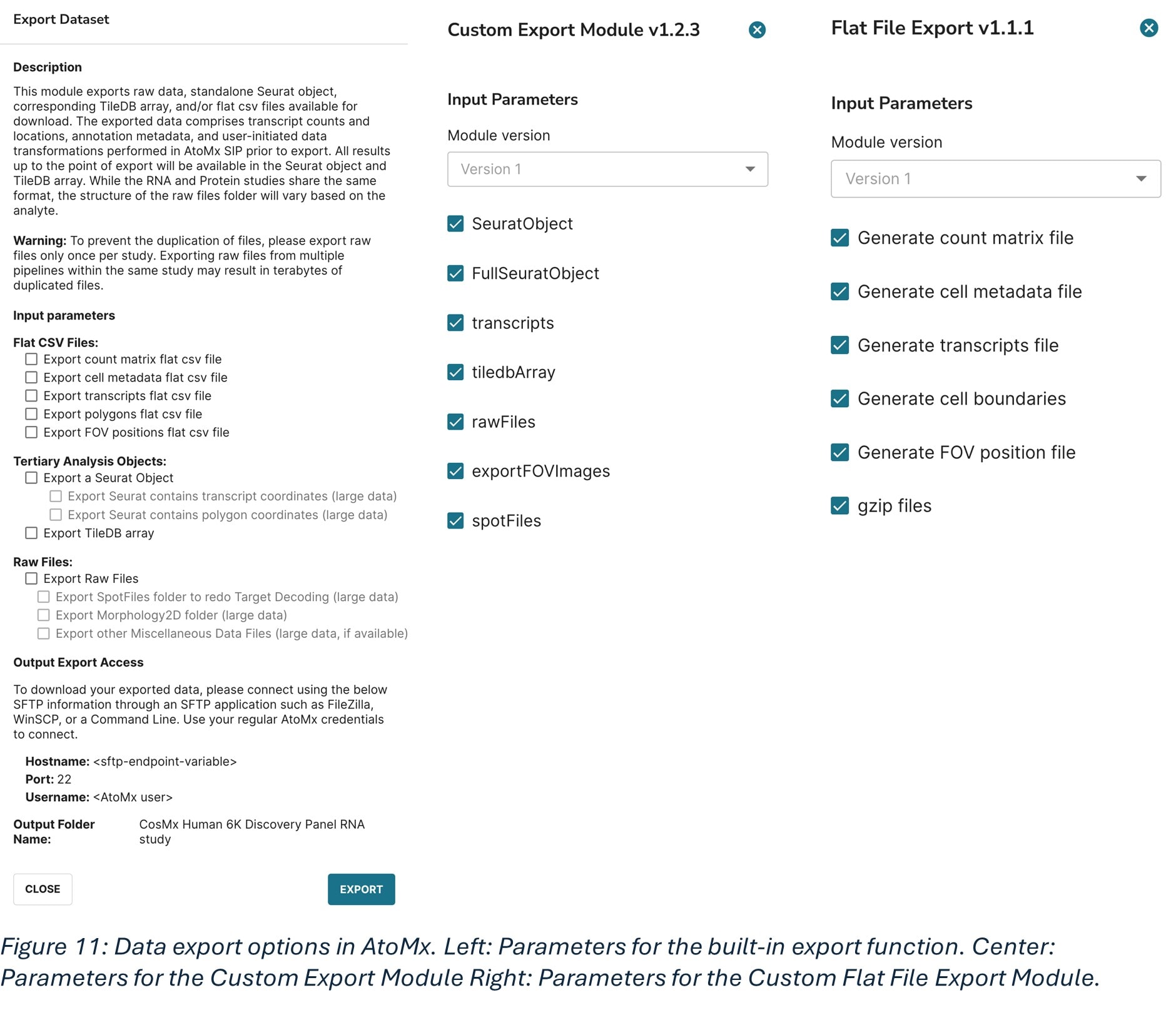 AtoMx facilitates the export of data and images for analysis with open-source tools (ex: Seurat, Squidpy), allowing for integration with existing opensource analysis workflows. Flow cell images can be exported directly from the Image Viewer (Figure 7), while data can be exported using either built-in or custom export modules (Figure 10). Exporting your raw data allows for further analysis and visualization of your CosMx data using various Python- and R-based single-cell analysis tools such as Seurat, Squidpy, scanpy, anndata, napari.