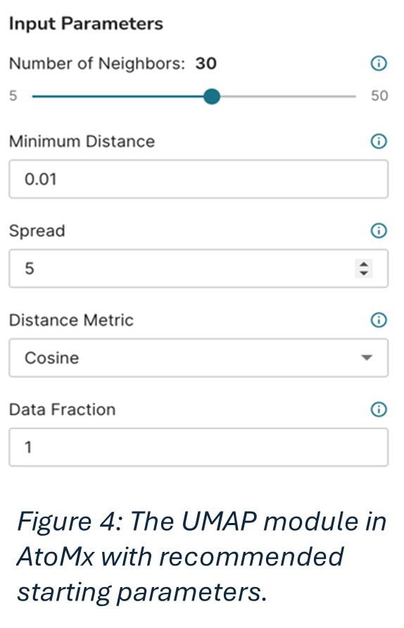 UMAP (Uniform Manifold Approximation and Projection) is an established technique for visualizing and distinguishing clusters of data through dimensionality reduction via non-linear estimation of related groups of cells or features. The input parameters used have a direct impact on the shape and structure of your UMAP, which can influence data interpretation. We recommend starting with the following workflow to plot your initial UMAP: