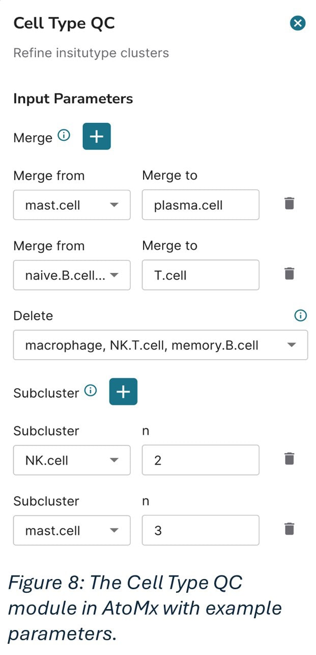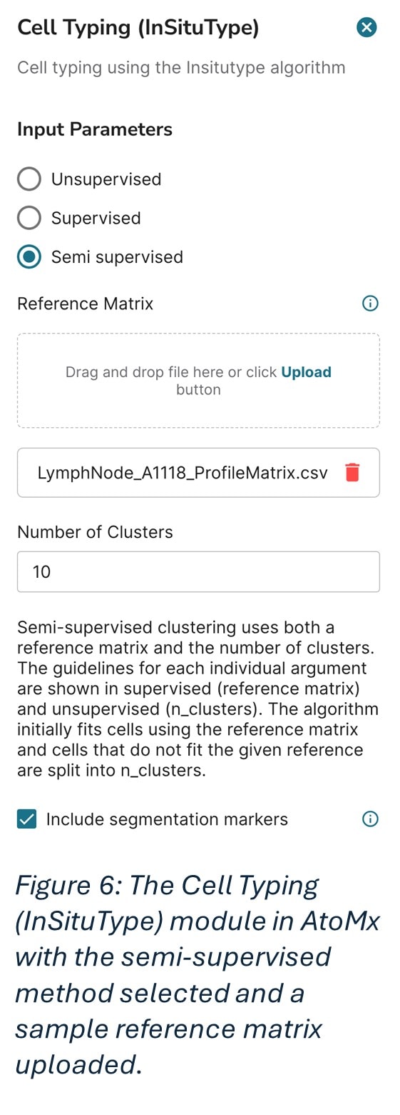 This module uses the InSituType algorithm to identify and subset data based on cell types (see Danaher et al. 2022). AtoMx offers 3 clustering methods: