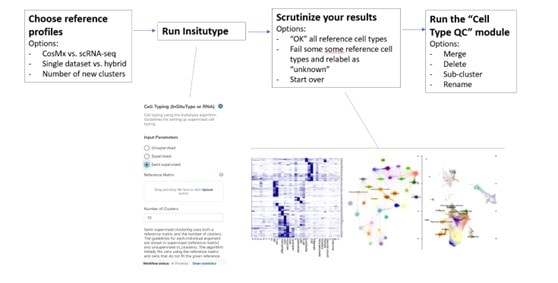 Cell typing is a critical step in characterizing spatial single cells prior to performing downstream analyses (e.g., neighborhood, spatial correlation, and differential expression). The InSituType Cell Typing module is the recommended method to cell type CosMx data because it is specifically designed to leverage the high-plex nature of CosMx assays. Like UMAP parameterization, cell typing is a deeply iterative process and requires iteration. For most studies, providing a reference matrix (also called a cell profile library) can often enhance the quality of your cell typing results.