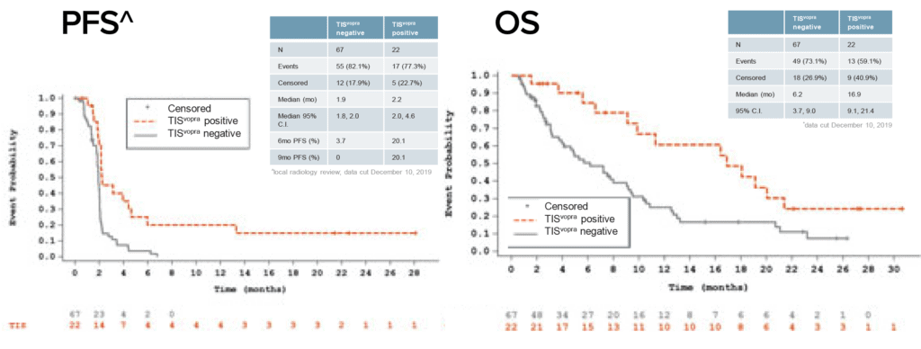 Similarly, a different retrospective analysis of immuno-oncology (IO)-naïve melanoma patients treated with pembrolizumab showed a trend toward higher rates of patients with progression-free-survival (PFS) and overall survival (OS) associated with a high TIS score;5Warren S, Danaher P, Schatton T. “Pretreatment gene expression correlation with clinical response to pembrolizumab or nivolumab in metastatic melanoma.” Presented at: 2017 Society for Immunotherapy of Cancer Annual Meeting; November, 2017; National Harbor, MD. these results were further supported across multiple tumor types by a pan-tumor study of pembrolizumab-treated patients.6Ott PA, Bang YJ, Piha-Paul SA, et al. “T-Cell-Inflamed Gene-Expression Profile, Programmed Death Ligand 1 Expression, and Tumor Mutational Burden Predict Efficacy in Patients Treated With Pembrolizumab Across 20 Cancers:” KEYNOTE-028. J Clin Oncol. 2019;37(4):318-327. doi:10.1200/JCO.2018.78.2276Li et al ASCO 2018 #578