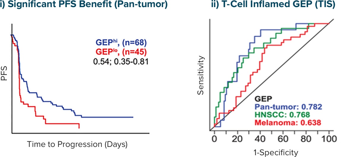 Indicating the infiltration level of tumors by T-cells, the TIS score, along with tumor antigenicity, has shown value as a predictor of patient response to pembrolizumab therapy.1Haddad RI, Seiwert TY, Chow LQM, et al. “Influence of tumor mutational burden, inflammatory gene expression profile, and PD-L1 expression on response to pembrolizumab in head and neck squamous cell carcinoma,” Journal for ImmunoTherapy of Cancer 2022;10 :e003026. doi: 10.1136/jitc-2021-003026 Gene expression profiling biomarkers like TIS derive their reliability from quantifying and weighting the relative expression levels of multiple genes to generate a score. The derived scores are compared to a predetermined cutoff value. The cutoff values for TIS can be adjusted to be specific to tumor type and treatment setting. A pan-cancer threshold, or cut-off, is thus possible for widespread use of the TIS assay, making TIS a gene expression profiling predictor of cancer treatment response across all tumor types examined.1Haddad RI, Seiwert TY, Chow LQM, et al. “Influence of tumor mutational burden, inflammatory gene expression profile, and PD-L1 expression on response to pembrolizumab in head and neck squamous cell carcinoma,” Journal for ImmunoTherapy of Cancer 2022;10 :e003026. doi: 10.1136/jitc-2021-003026 2Ayers M, Lunceford J, Nebozhyn M, et al. “IFN-γ-related mRNA profile predicts clinical response to PD-1 blockade.” J Clin Invest. 2017;127(8):2930-2940. doi:10.1172/JCI91190
