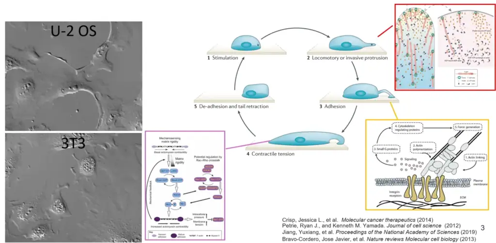Will discusses the significance of understanding cell migration, especially in contexts like normal cell development and diseases such as metastatic cancer, as it involves various biophysical processes and molecular components. Different types of cell migration exist, characterized by distinct behaviors and protein expressions. The ability of cells to transition between these states, known as plasticity, adds further complexity. To comprehend this heterogeneity, understanding the regulation of these behaviors is crucial, akin to examining the mechanics of a racing car to understand its performance.