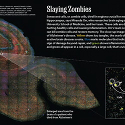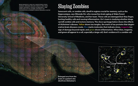 Senescent cells, or zombie cells, dwell in regions crucial for memory, such as the hippocampus, says Miranda Orr, who researches brain aging at Wake Forest University School of Medicine, and her team. These cells are damaged but they linger, hurting healthy cells and causing inflammation. Orr’s team is studying whether drugs can kill zombie cells and restore memory. The close-up image above shows the effects of Alzheimer’s disease. Yellow shows tau tangles, the snarls of tau proteins that degenerative brain diseases create. Blue marks molecules that indicate stress, magenta is a sign of damage beyond repair, and green shows inflammation. When blue, magenta, and green all appear in a cell, especially a large cell, that’s evidence it is a zombie cell. (Graphic: NanoString)