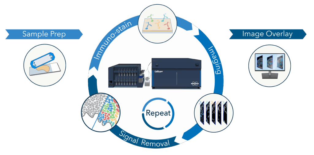 The CellScape platform is an integrated spatial proteomics system combining flexible staining with EpicIF signal-removal chemistry, high-resolution HDR imaging, and automated image alignment to deliver clean, quantitative single-cell data across cycles.