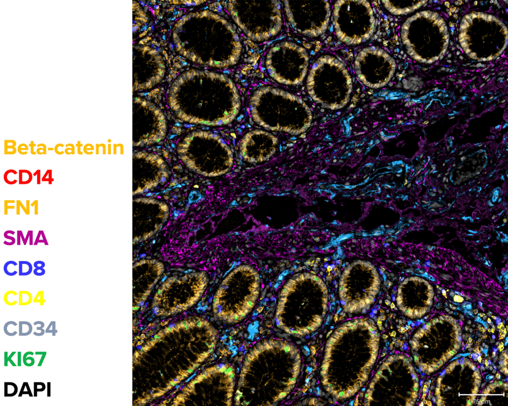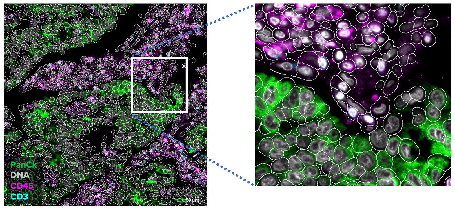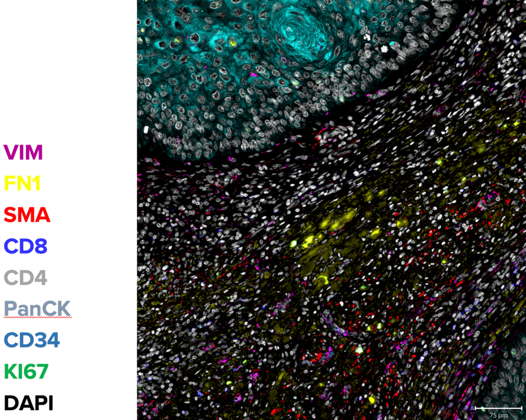 The CosMx® Human Immuno-Oncology Protein Panel enables high-plex spatial analysis of more than 64 proteins from a single FFPE slide at subcellular resolution. Profile expression of different Immune and Oncology-related proteins to get a comprehensive view of the spatial phenotyping landscape, including tissue heterogeneity, signaling pathways, and tumor progression.