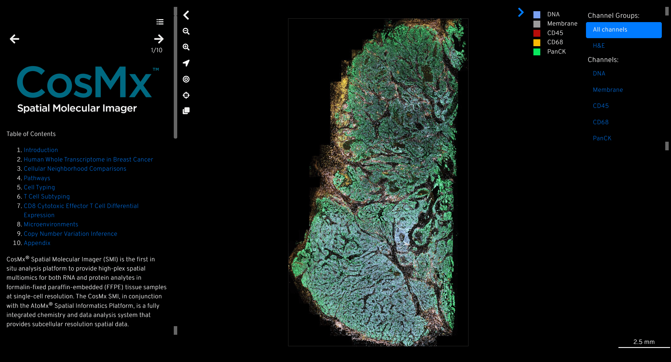 Whole transcriptome spatial data from breast tissue. The immunofluorescence image below shows PanCK in green, membrane in gray, CD45 in red, CD68 in yellow and DAPI in blue.
