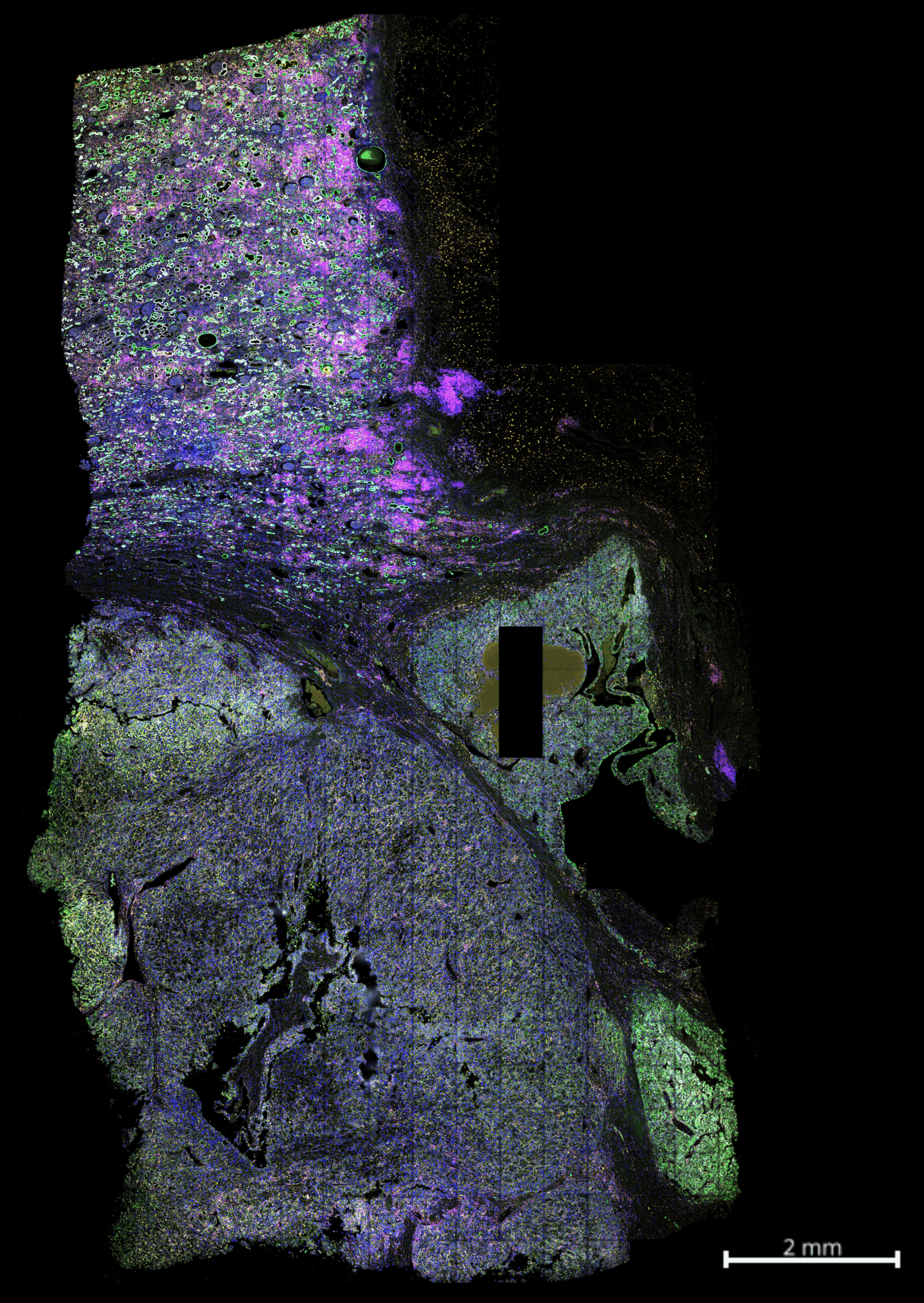 Whole transcriptome spatial data from kidney tissue. The immunofluorescence image below shows CD45 in red, DNA in blue, CD68 in yellow, Membrane in gray, PanCK in green.