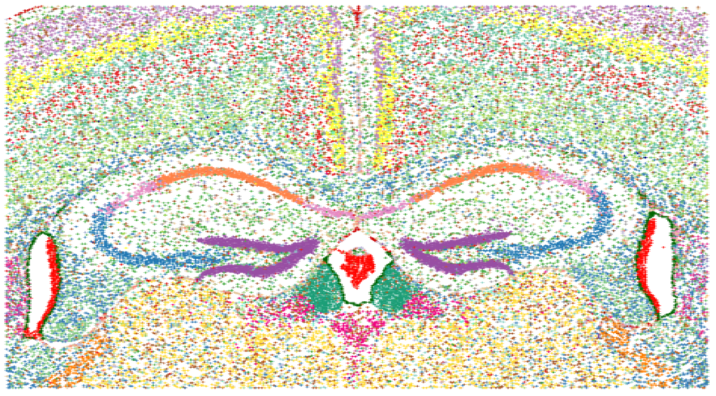 Cell type map of mouse brain. Initial image depicts morphology stain of half mouse brain, which then zooms to show spatially resolved transcript location of mRNA targets overlaid with morphology stain. This fades to a spatially resolved transcript location of mRNA targets overlaid with Cell Type results, which is then enlarged to a region of interest with Cell Type results overlaid with transcripts.