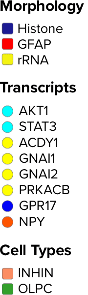 In this dataset, we observe GPR17 (Transcript – Blue), a G-protein-coupled receptor known to modulate glycolysis and lactate production in OLPCs,1https://www.cell.com/cell-reports/fulltext/S2211-1247(19)30239-6 at high levels in an OLPC adjacent to NPY+ INHINs. We can see genes common to many signaling pathways, including pathways downstream of lactate detection, AKT and STAT3 (Transcript – Cyan) in both GPR17+ OLPCs and adjacent NPY+ INHIN cell types.1https://www.cell.com/cell-reports/fulltext/S2211-1247(19)30239-6 Also detected are known signaling pathways downstream of GPR17 (Transcript – Yellow) in OLPCs. And with single-cell, spatial resolution researchers can study the interaction between these OLPC and INHIN cells.