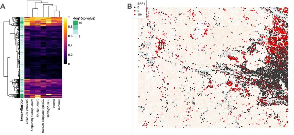 The data can be used to analyze changes in gene expression patterns of any given cell type based on spatial context as shown here with macrophages. For example, within the NSCLC dataset, macrophages express more SPP1 in the tumor interior and tumor-stroma boundary than they do in more immune-rich settings.