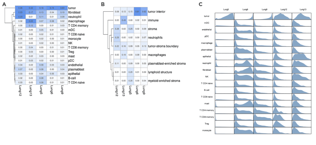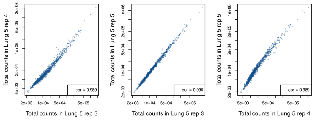 Single cell in situ data was generated from three serial sections of the “Lung 5” sample. While these three FFPE sections include different cells, they capture the same regions of the tumor microenvironment. The analysis of these three replicates shows high correlation between each section, indicating a high level of reproducibility.