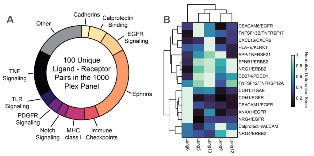 CosMx SMI enables analysis for the enrichment of pairwise ligand-receptor expression between interacting cell types. When examining the NSCLC dataset, of these, 16 were significantly enriched at the interface between tumor cells and T cells. Interestingly one of these pairs, the immune checkpoint PD-L1/PD-1 (CD74/PDCD1), exhibited a high degree of variation in Tumor to T cell co-expression.
