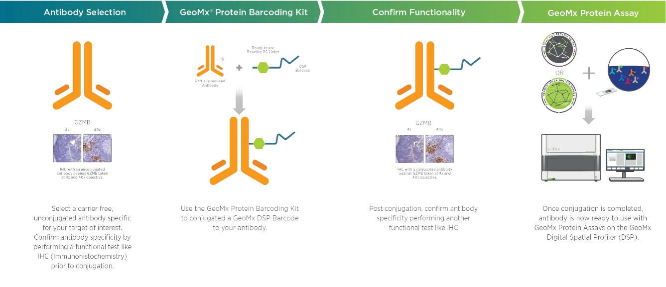 The Custom Protein Workflow enables researchers to barcode antibodies of interest for use with GeoMx DSP. Antibodies are barcoded with either the Protein Barcoding Service or with the Protein Barcoding Kit. After barcoding, antibodies are ready to be utilized on GeoMx DSP with GeoMx Protein Assays.