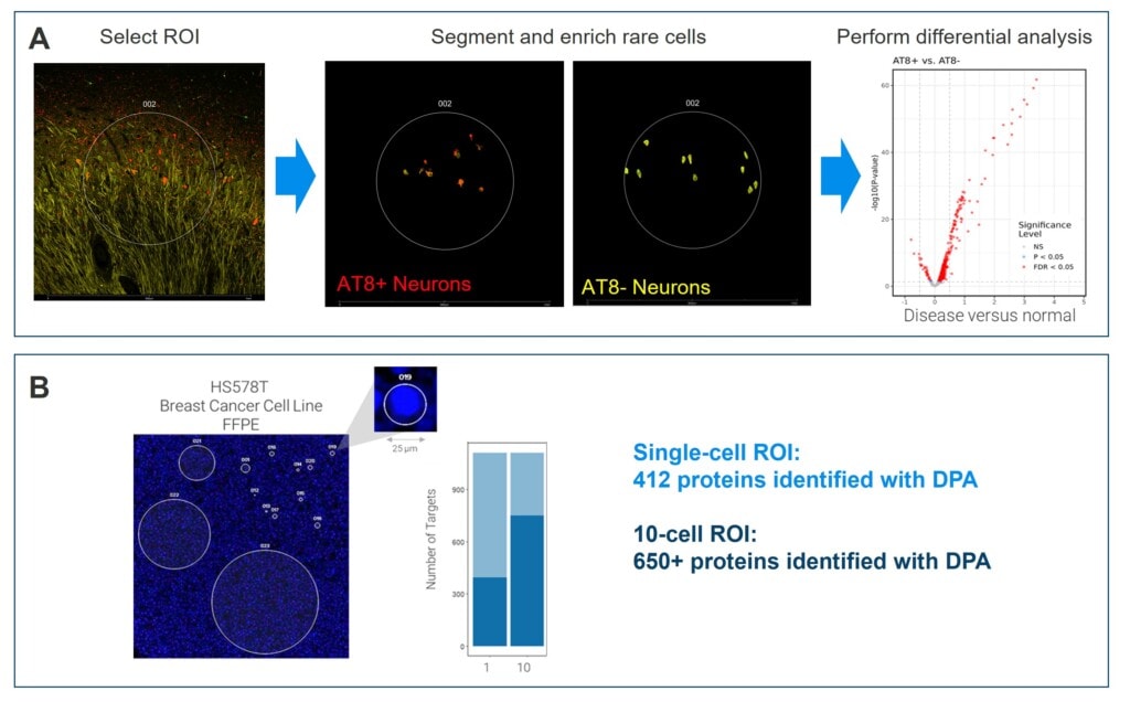 A, Single-cell segmentation to investigate the expression of 1200+ proteins on enriched rare AT8+ and AT8- cells. B, Proof-of-concept experiment showing a Region of Interest (ROI) drawn around a single HS578T cell enabling the detection of 412 proteins. As expected, enrichment of 10 cells within a single ROI resulted in higher target detection (650+).