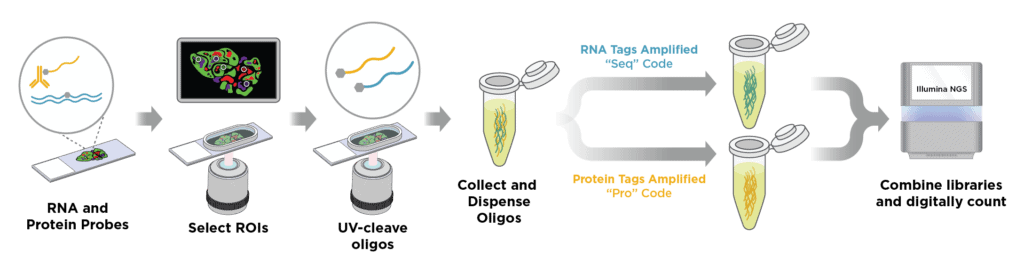 Selected ROIs are illuminated with UV light, releasing the indexing barcodes that are then sequenced and counted on an Illumina Next-Generation Sequencer (NGS) system for mapping expression of individual RNAs and proteins back to each ROI. Updated probe chemistry enables same-slide co-detection of RNA and protein for the same sequencing depth and cost as separate detection with serial sections.