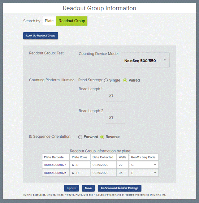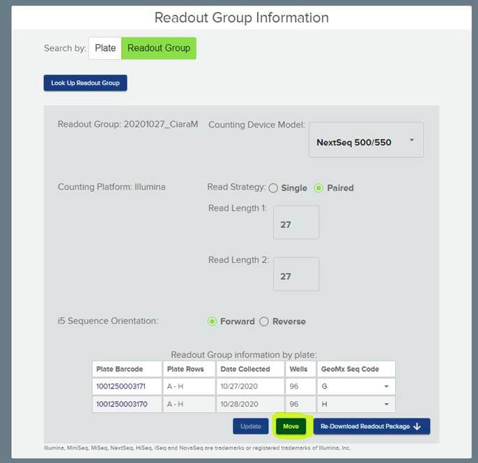 - Clicking on move will pull up a screen to select the collection plate to be moved from one readout group to the other.