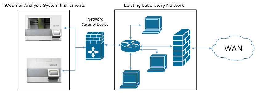 Yes, a network security appliance can be used in conjunction with the nCounter Pro Analysis System. The appliance would be installed between the nCounter Pro Analysis System and the existing network per the schematic shown below: